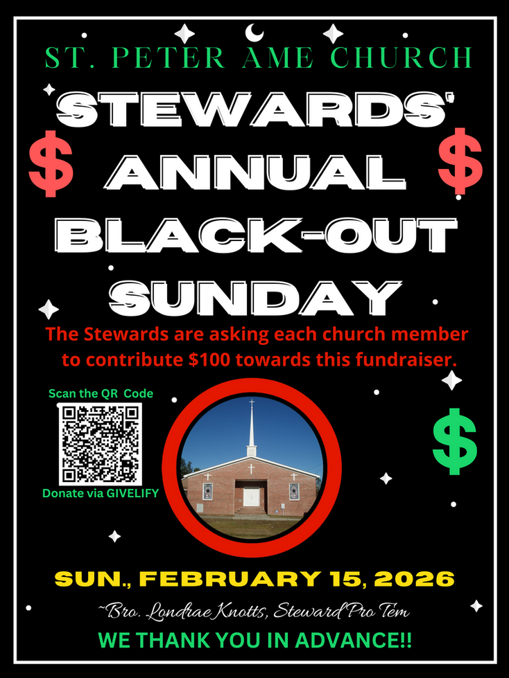 Each year, our Steward Board sponsors a "Black-Out Sunday" Fundraiser. They are asking each church member to donate $100. MARK YOUR CALENDARS NOW for Sunday, February 15, 2026!!